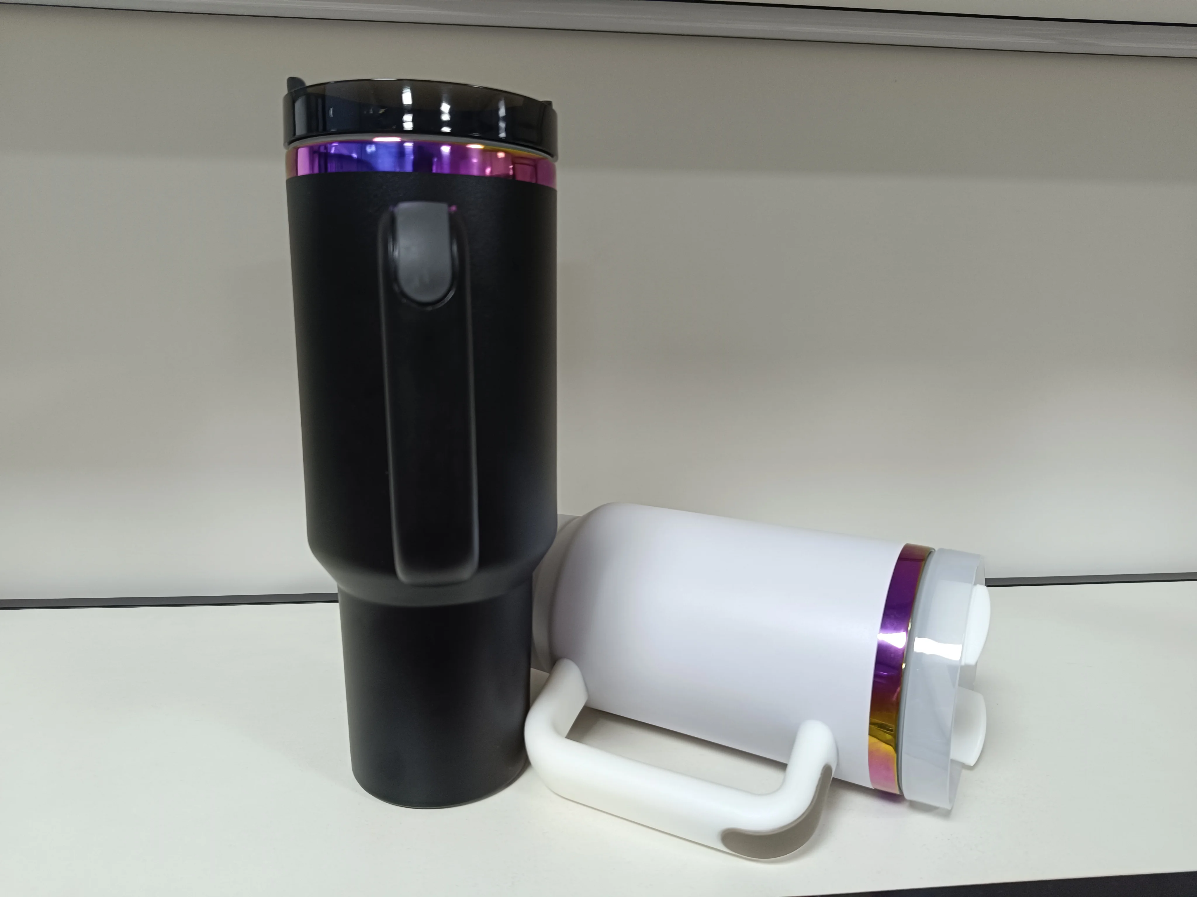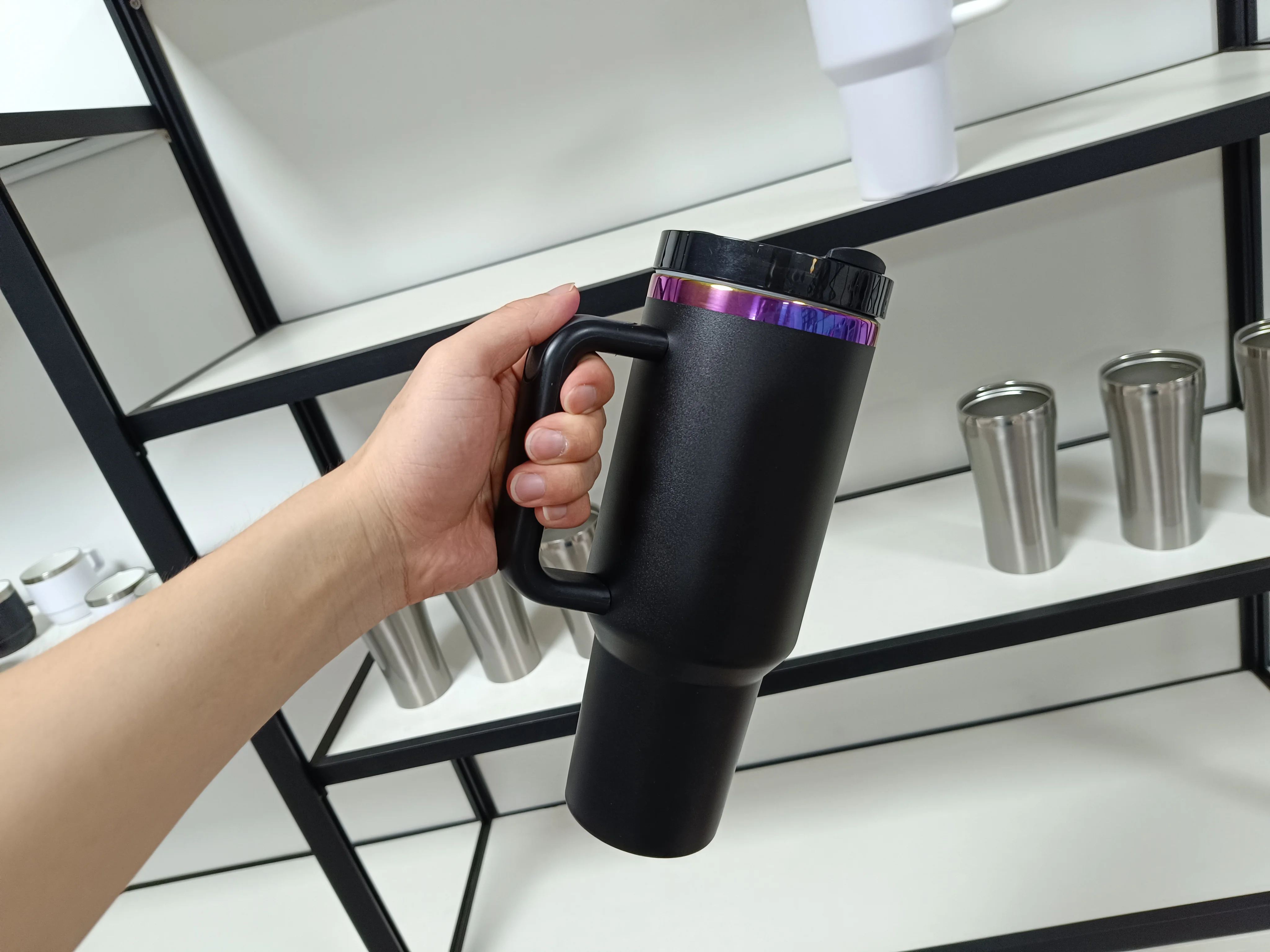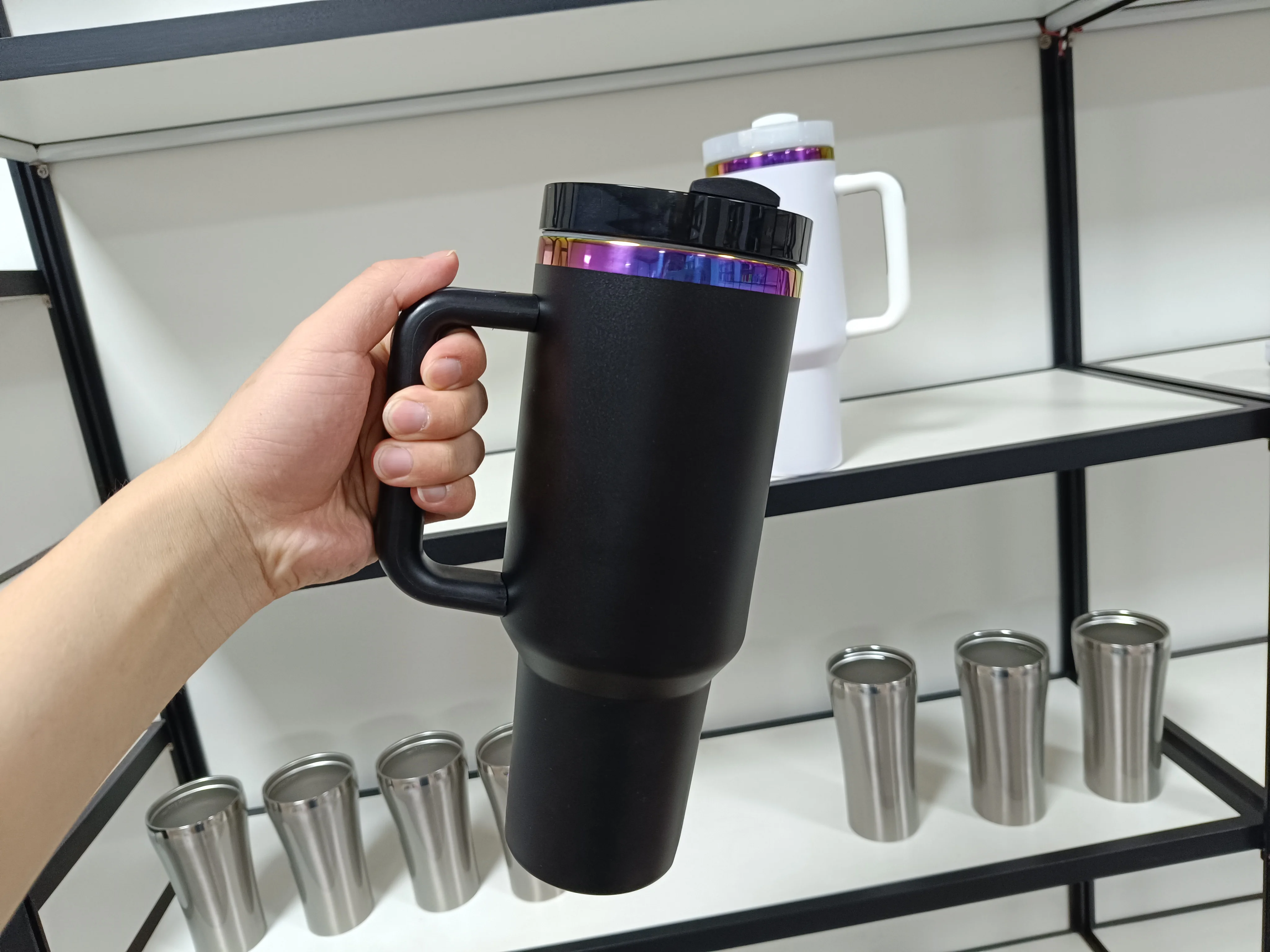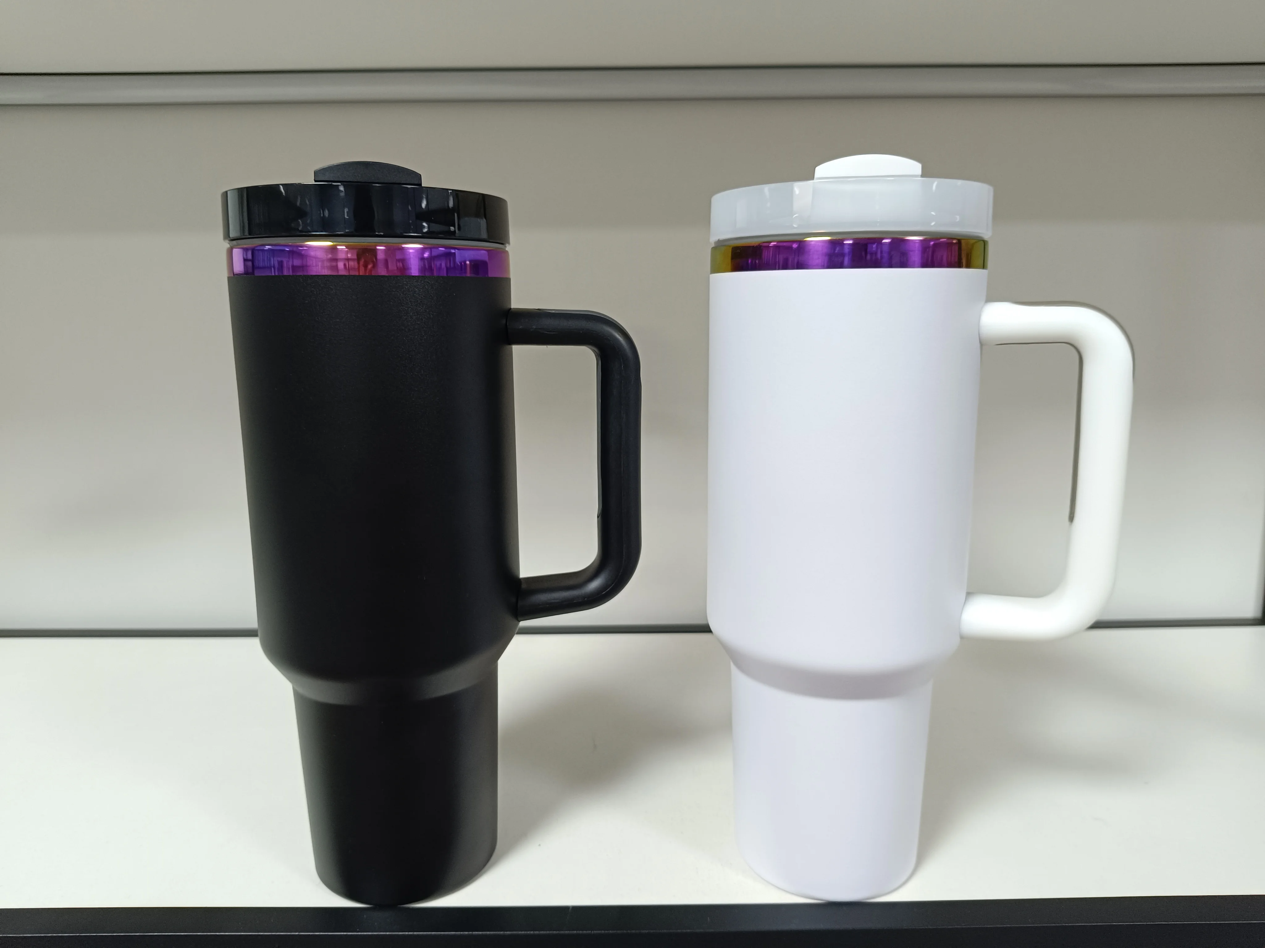 Nouveau gobelet noir de 40 oz avec poignée et paille, tasse de voyage en acier inoxydable avec revêtement en poudre, gobelet plaqué arc-en-ciel