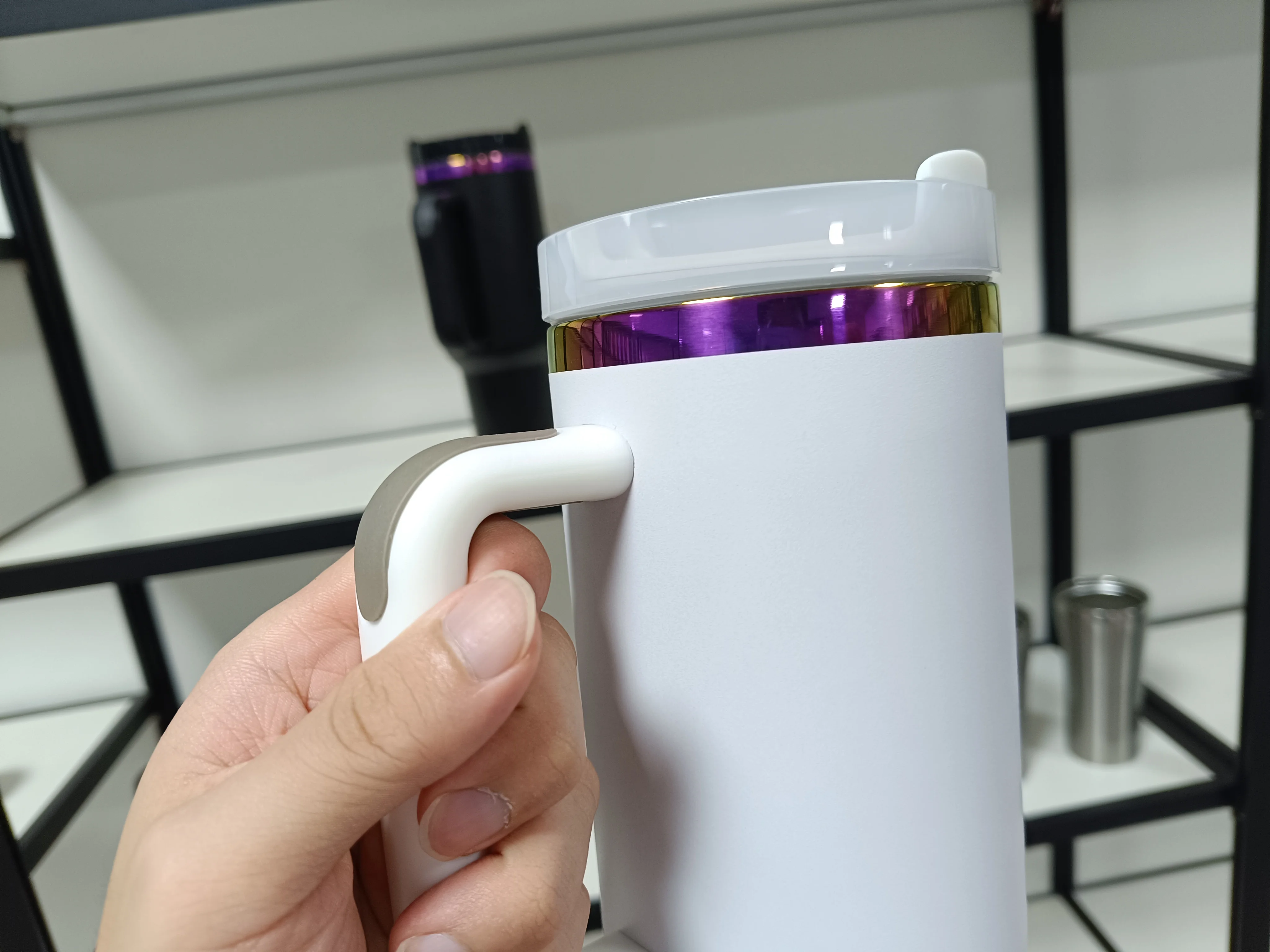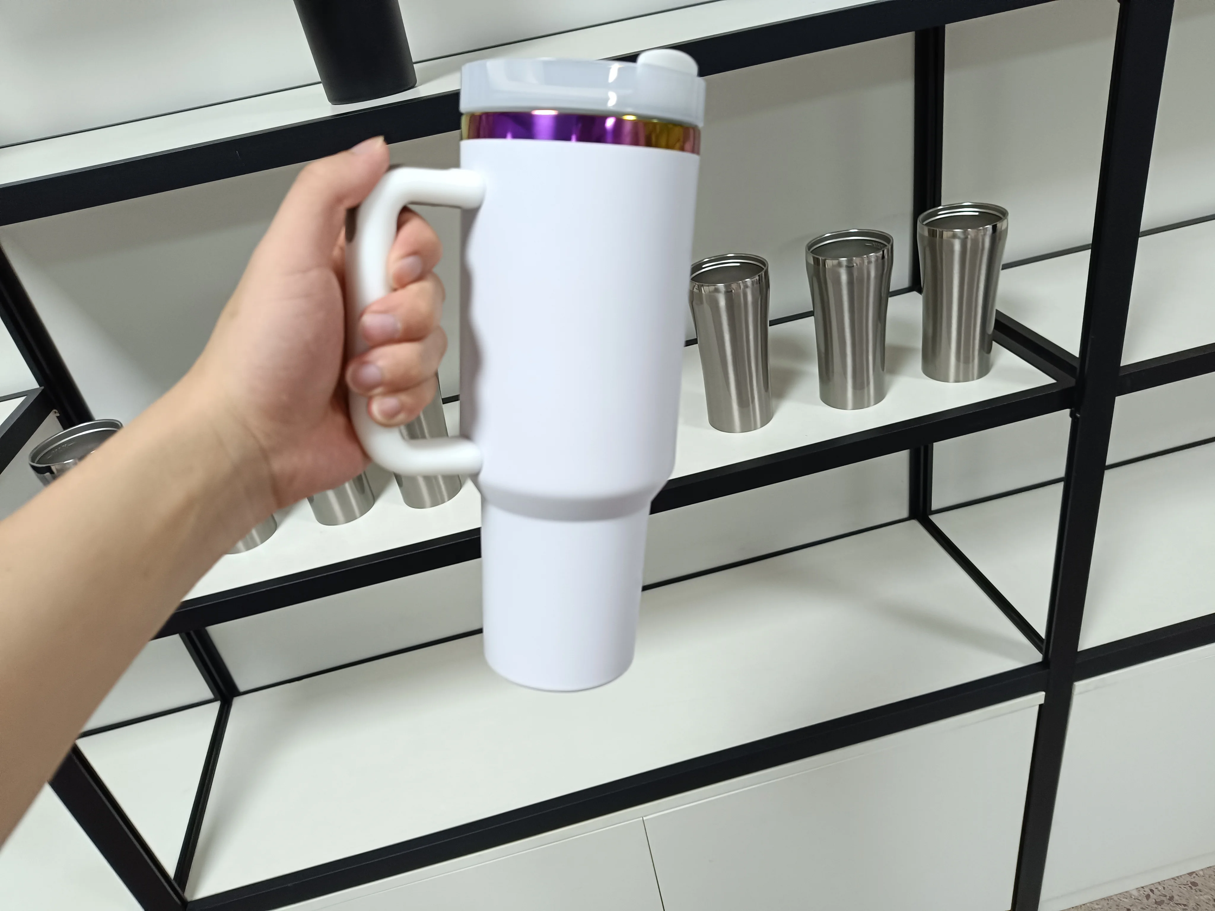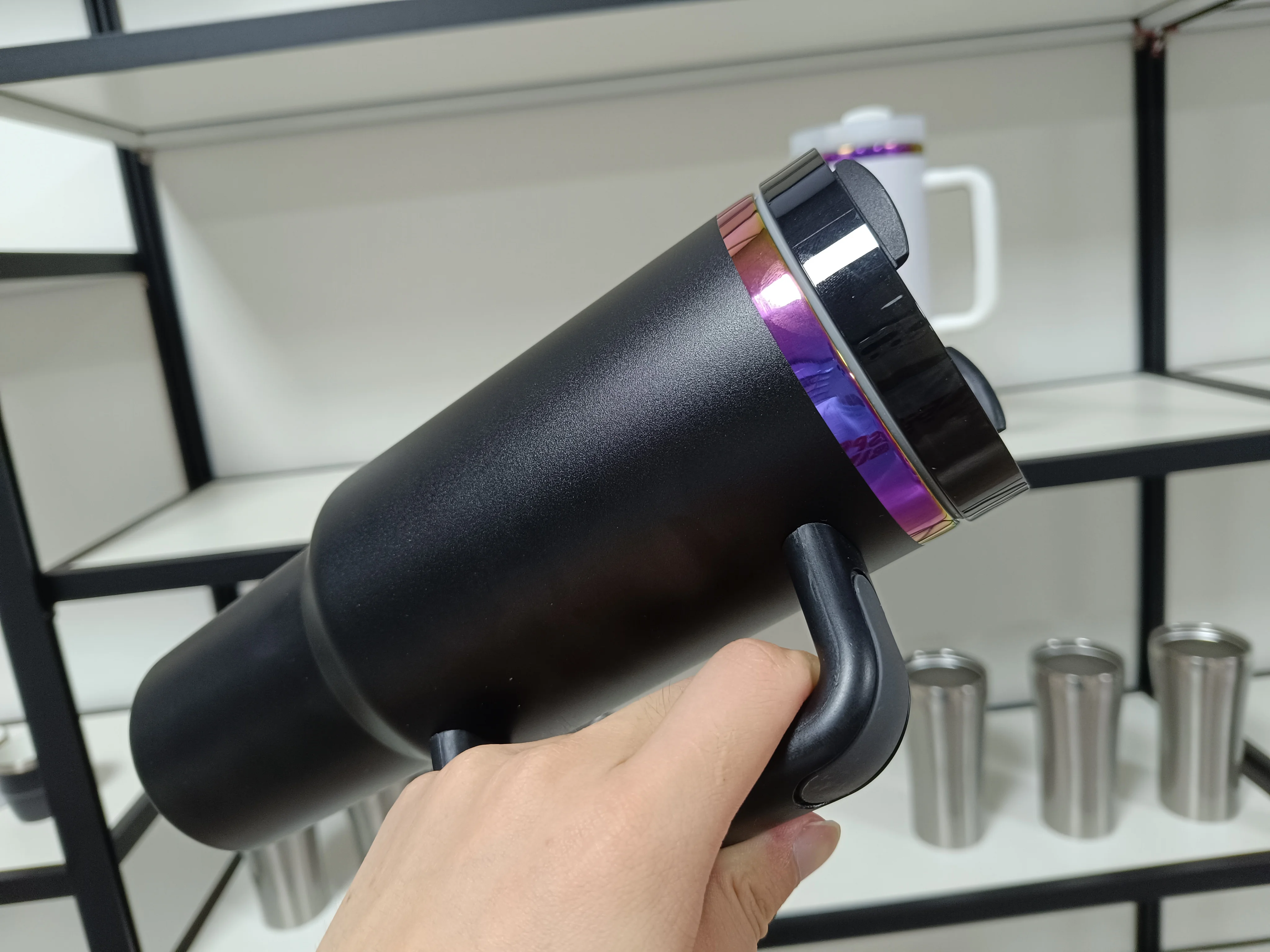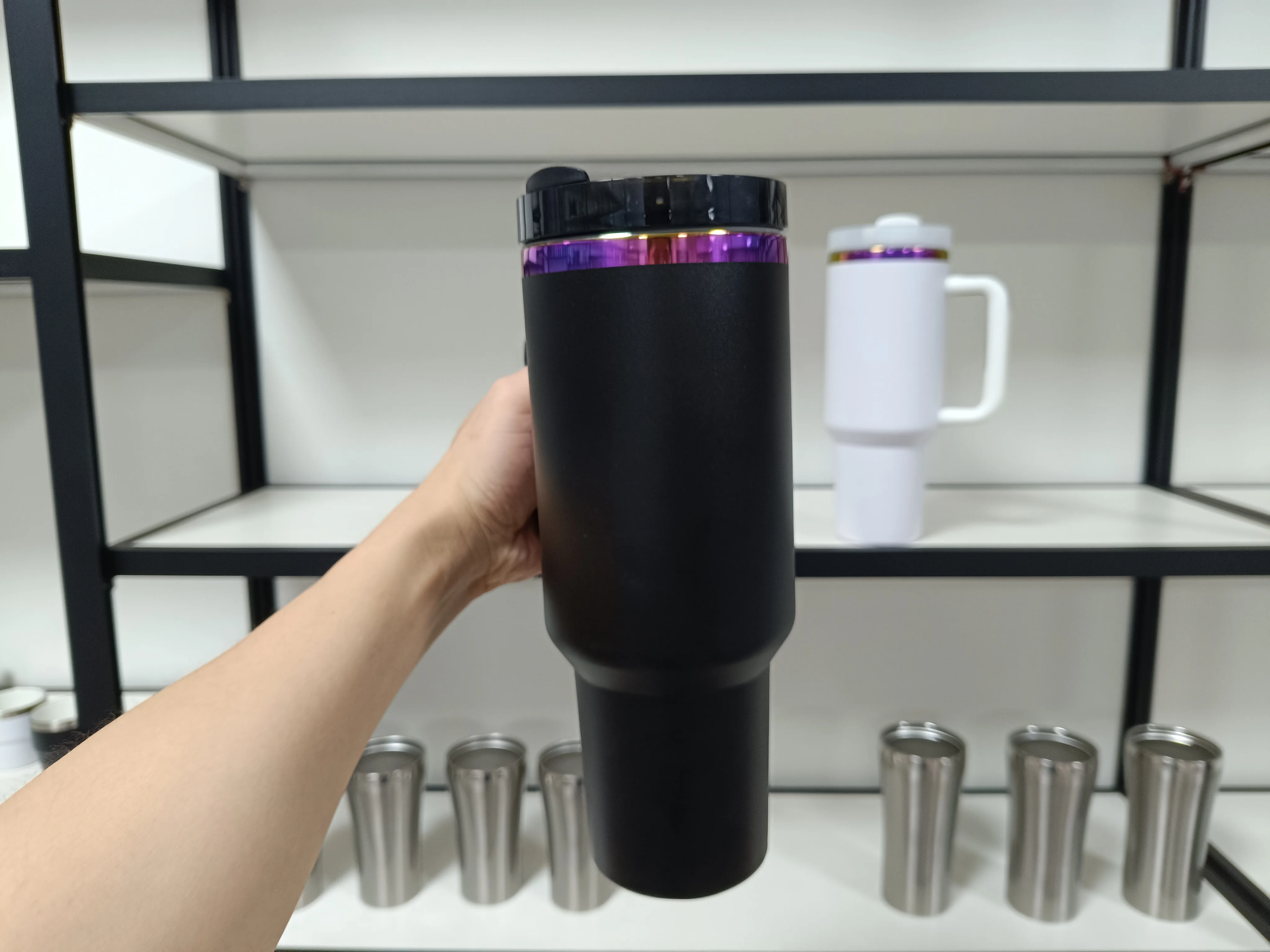Nouveau gobelet noir de 40 oz avec poignée et paille, tasse de voyage en acier inoxydable avec revêtement en poudre, gobelet plaqué arc-en-ciel